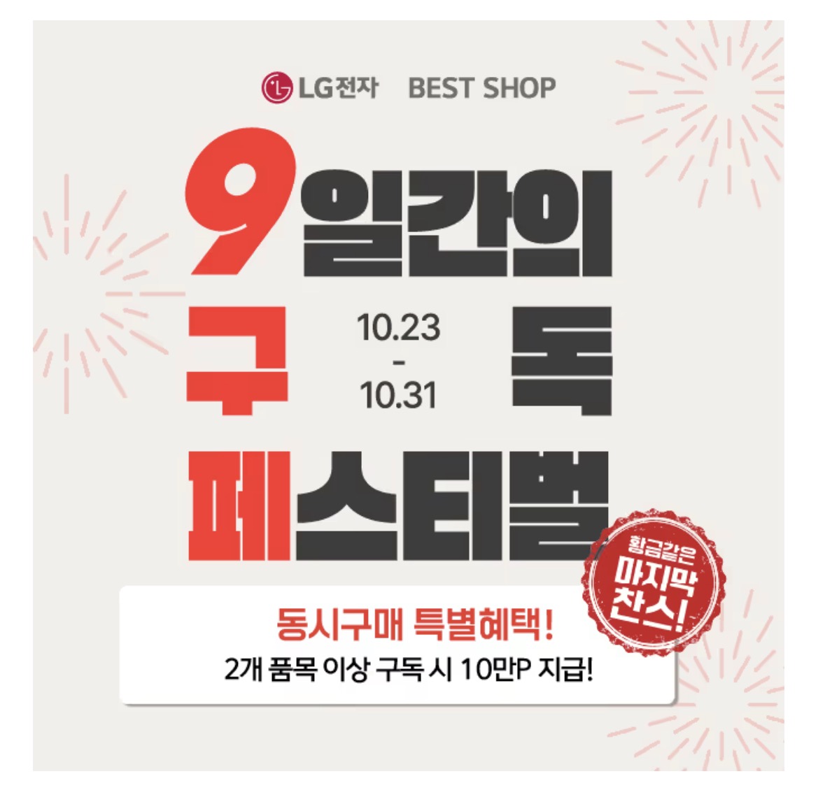 🎁 LG전자 베스트샵은 10월 마지막 찬스로 총 ㅇ일 동안 구독 페스티벌을 진행합니다. 여기서 ㅇ에 들어갈 숫자는 무엇일까요?