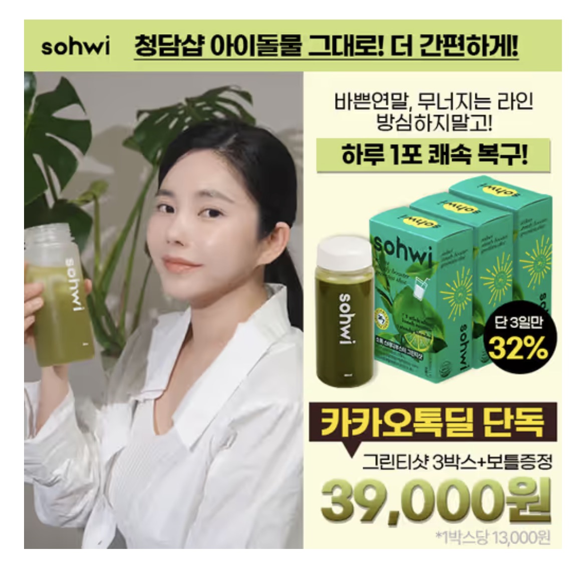 🎁 바쁜 연말, 많아지는 약속, 무너지는 라인? 뷰티인플루언서 PICK! V라인 긴급관리템으로 도와드릴게요. 지금 시작하세요. 소휘 그린티샷의 기름기 관리 핵심은 ㅇㅇㅇ 3단계 시너지 블렌디드! 녹차의 '카테킨' > 카테킨 흡수를 돕는 '레몬,라임' > 설탕 대신 천연당 '프락토 올리고당'으로 몸이 원하는 변화를 느껴보세요. 여기서 ㅇㅇㅇ은?